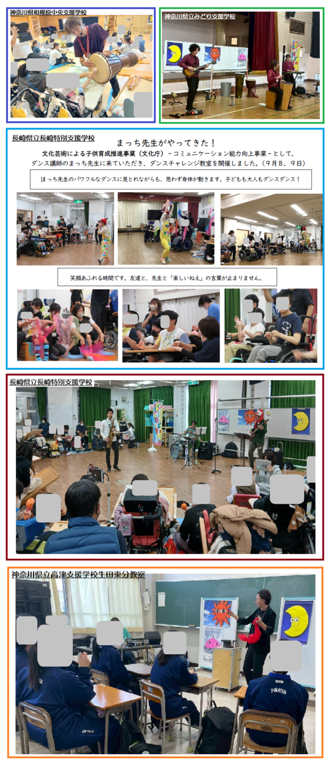 神奈川県立麻生養護学校 / 神奈川県立秦野養護学校 / 神奈川県立あおば支援学校 / 神奈川県立保土ケ谷養護学校 / 川崎市立中央支援学校 / 川崎市立田島支援学校 / 川崎市立聾学校に於いて、ワークショップを41回開催